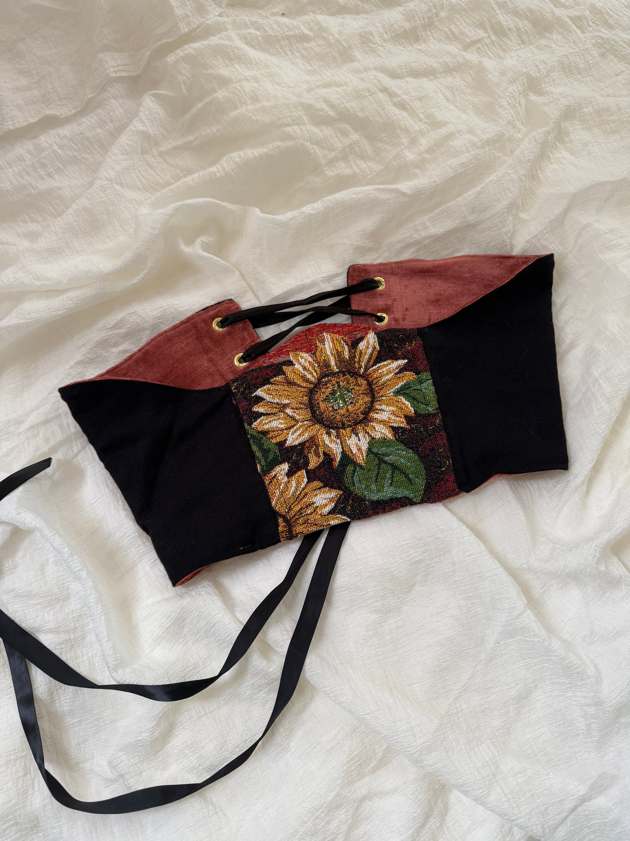 A minimal, elegant under bust corset designed for easy layering. This corset features a warm rust colored velvet on one side and solid black linen on the reverse, making it a versatile piece for styling day or night. It’s fully boned for gentle shaping, with a lace up back for an adjustable, comfortable fit.