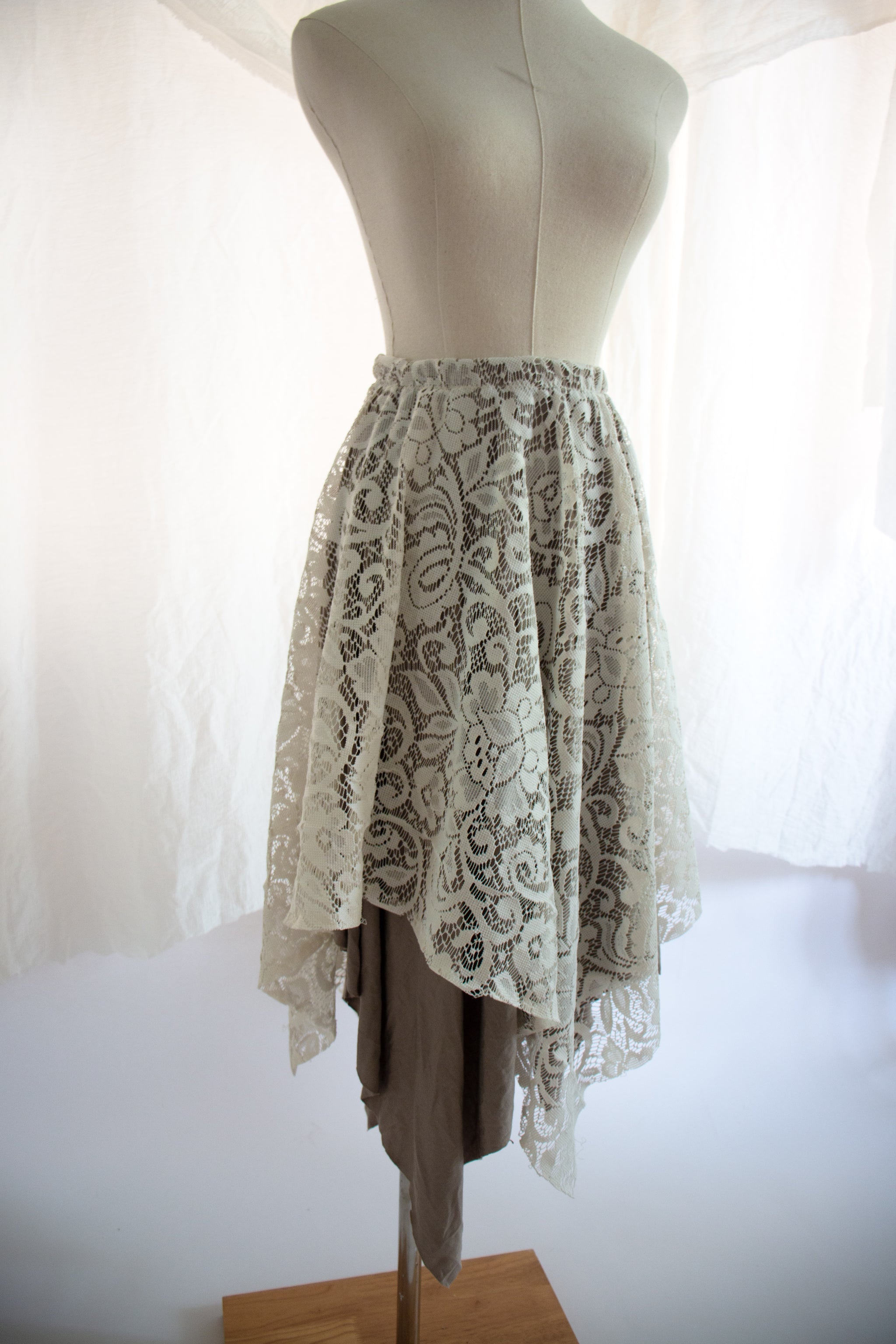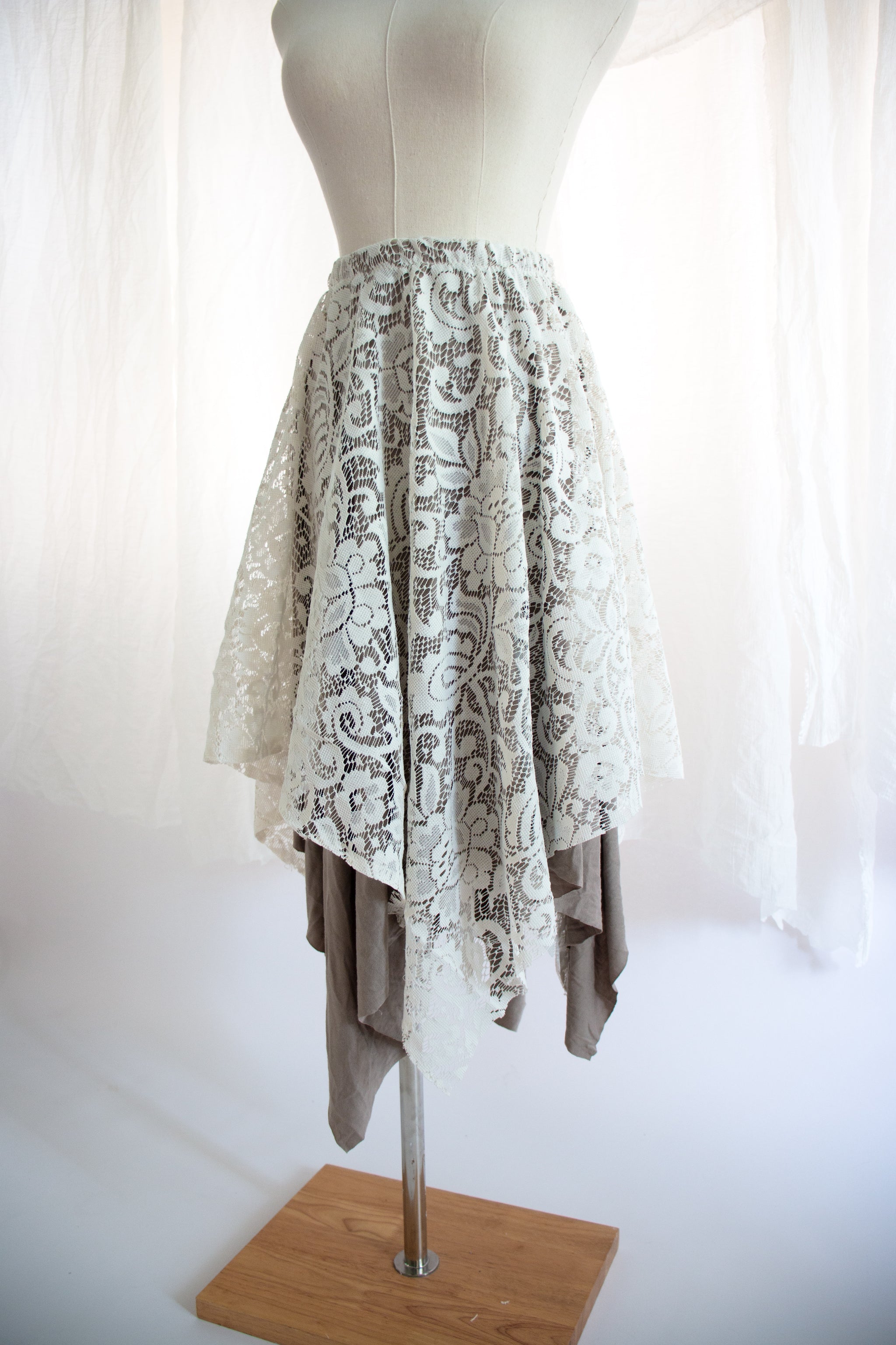 This skirt is made from layered vintage lace and soft ivory fabric for a tone-on-tone look that’s dreamy and versatile. The high-low hemline creates movement with every step, while the elastic waistband makes it comfortable for all-day wear.