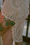 This skirt is a love letter to heirloom textiles. Made from carefully sourced vintage doilies and crocheted linens, it blends warm cream tones with soft florals and earthy greens for a truly unique patchwork design. The asymmetrical hemline gives it a dreamy, effortless feel. Perfect for layering or dressing up for a market day. By giving these handworked pieces a new life, this skirt keeps a bit of history twirling with you.